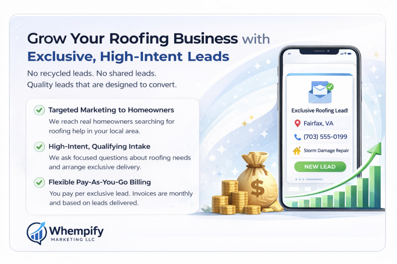 Whempify Marketing LLC assists contractors in building a predictable customer pipeline by generating high-intent homeowner inquiries and delivering them as Exclusive Roofing Leads. No recycled lists. No shared lead blasts. One Homeowner. One Contractor. Never Sold Twice. Just a clean, service-area aligned lead flow built for fast follow-up.